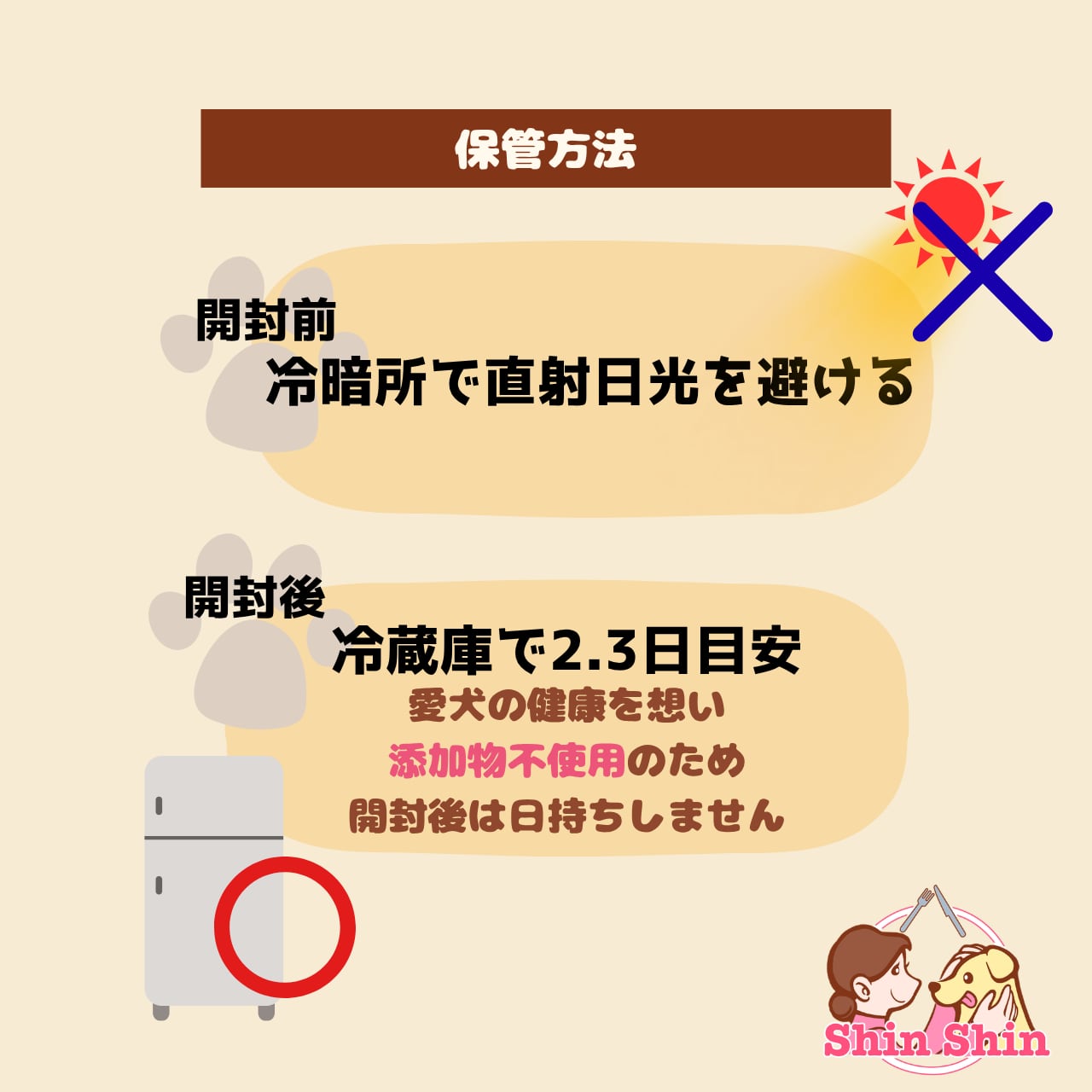 ●本品は保存料・添加物不使用の犬用おやつです。開封後は冷蔵庫で保管し、ぜひお早めにお与えください。